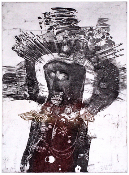 Radierungen der 80er Jahre Inversion 1Aquatinta, 49 x 39 cm, 1980 (zu Jewgeni Schwarz, Der Drache)Inversion IIAquatinta, 49 x 39 cm, 1980 (zu Jewgeni Schwarz, Der Drache)Der freundliche GeneralAquatinta/Kaltnadel, 50 x 35 cm, 1981Geschlagener AlterAquatinta/Kaltnadel, 32 x 24 cm, 1981Der rote ChristusReservage/Kaltnadel, 37 x 31 cm, 1981 (Che Guevara gewidmet)Versehrter Mars mit GefolgeReservage/Kaltnadel, 25 x 20 cm, 1982Ritter Tod und TeufelReservage/Kaltnadel, 25 x 20 cm, 1982Prometheus 82Aquatinta/Kaltnadel, 38 x 30 cm, 1982Für Martin Luther KingAquatinta/Reservage, 35x 25 cm, 1982Lateinamerikanische Palmen (Ernesto Cardenal), Psalm 21, Mein Gott, mein Gott – warum hast Du mich verlassen?Aquatinta/Kaltnadel, 25 x 25 cm, 1983 Zu den Lateinamerikanische Palmen von Ernesto Cardenal entstanden 12 Aquatinta/Kaltnadel-Radierungen, von denen 8 in der Publikation des Union Verlages Berlin erschienen sind. Die komplette Reihe ist unter Folgen und Zyklen - Thematische Folgen - Lateinamerikanische Palmen zu finden.Der Ball auf der Titanic; MaskeradeAquatinta/Strichätzung, 34 x 39 cm, 1983 Teil der Folge ”Der Ball auf der Titanic, wozu zwei weitere Blätter gehören, die unter: Folgen und Zyklen - Thematische Folgen - Könige/Narren - Narrenschiffe zu finden.Bau des NarrenschiffsAquatinta/Strichätzung, 34 x 39 cm, 1985Auf dem KarussellAquatinta/Strichätzung, 32 x 35 cm, 1985Manege freiAquatinta/Strichätzung, 31 x 28 cm, 1986Neue Windmühle für Don QuichoteAquatinta/Strichätzung, 32 x 24 cm, 1986Abgang von der BühneAquatinta/Reservage, 30 x 30 cm, 1987Gesellschaft vom Wind gebeuteltStrichätzung, 24 x 29 cm, 1987Verwirrte Gesellschaft beim Erscheinen der apokalyptischen ReiterStrichätzung/Reservage, 30 x 34 cm, 1987Als Noahs Arche ankerteStrichätzung, 23 x 27 cm, 1987Ausritt der alten MännerAquatinta/Reservage, 42 x 50 cm, 1988Sie nannten es KristallnachtAquatinta/Strichätzung, 30 x 24 cm, 1988Adam und Eva verlassen das sehr behütete Paradiesfarb. Aquatinta/Strichätzung, 28 x 24 cm, 1989Michel und seine TraumweltAquatinta/Kaltnadel, 28 x 24 cm, 1989Als auf dem Kasperletheater wirklich noch alles in Ordnung warAquatinta/Kaltnadel, 43 x 50 cm, 1989 Diese Radierung ist eine von 5 Radierungen, die zu der Blattfolge „Spielkiste” gehören. Die komplette Reihe ist unter Folgen und Zyklen - Thematische Folgen - „Spielkiste” zu finden.